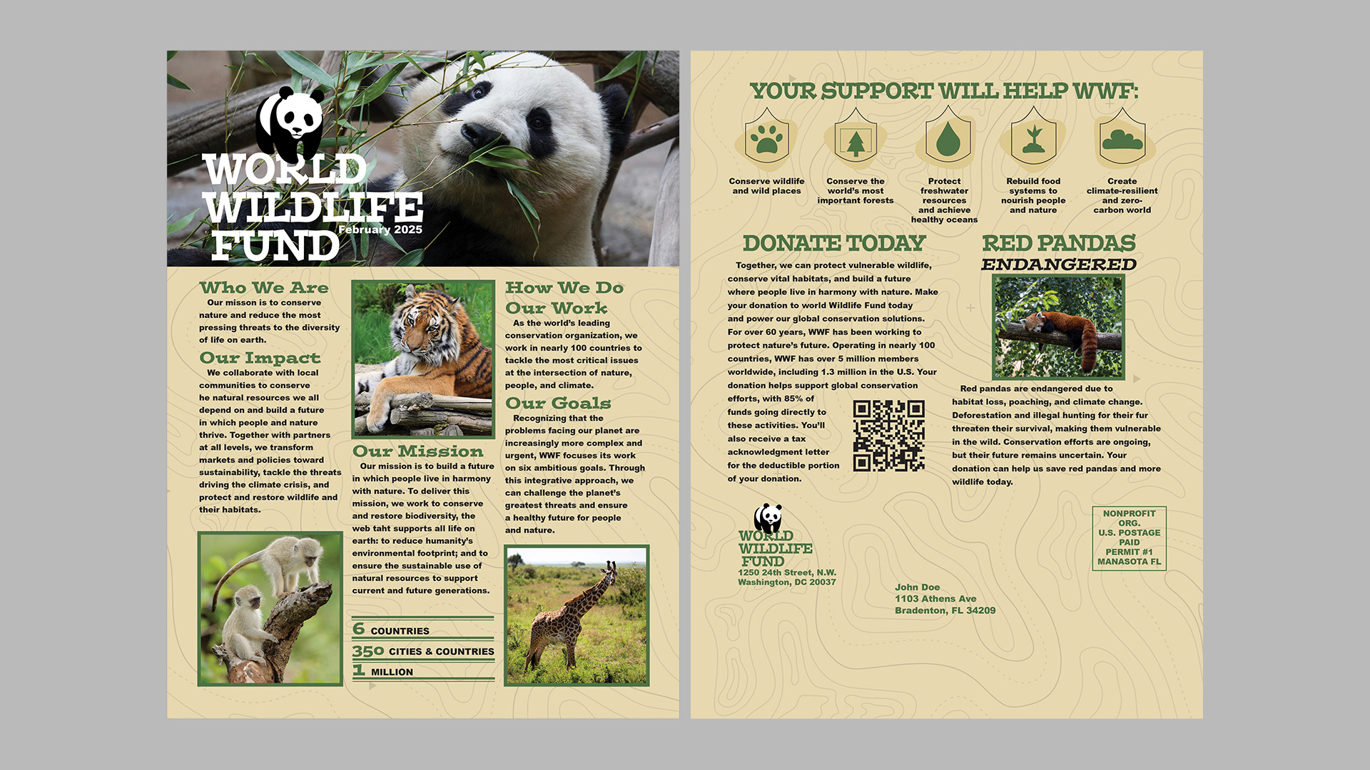 The design uses earthy tones, topographic textures, and wildlife imagery to create an engaging print piece that feels consistent with WWF’s brand. Each section is organized to guide the reader through key information, ending with a call-to-action and mailing panel formatted for postal distribution. This project demonstrates my ability to balance storytelling, branding, and functional print design.