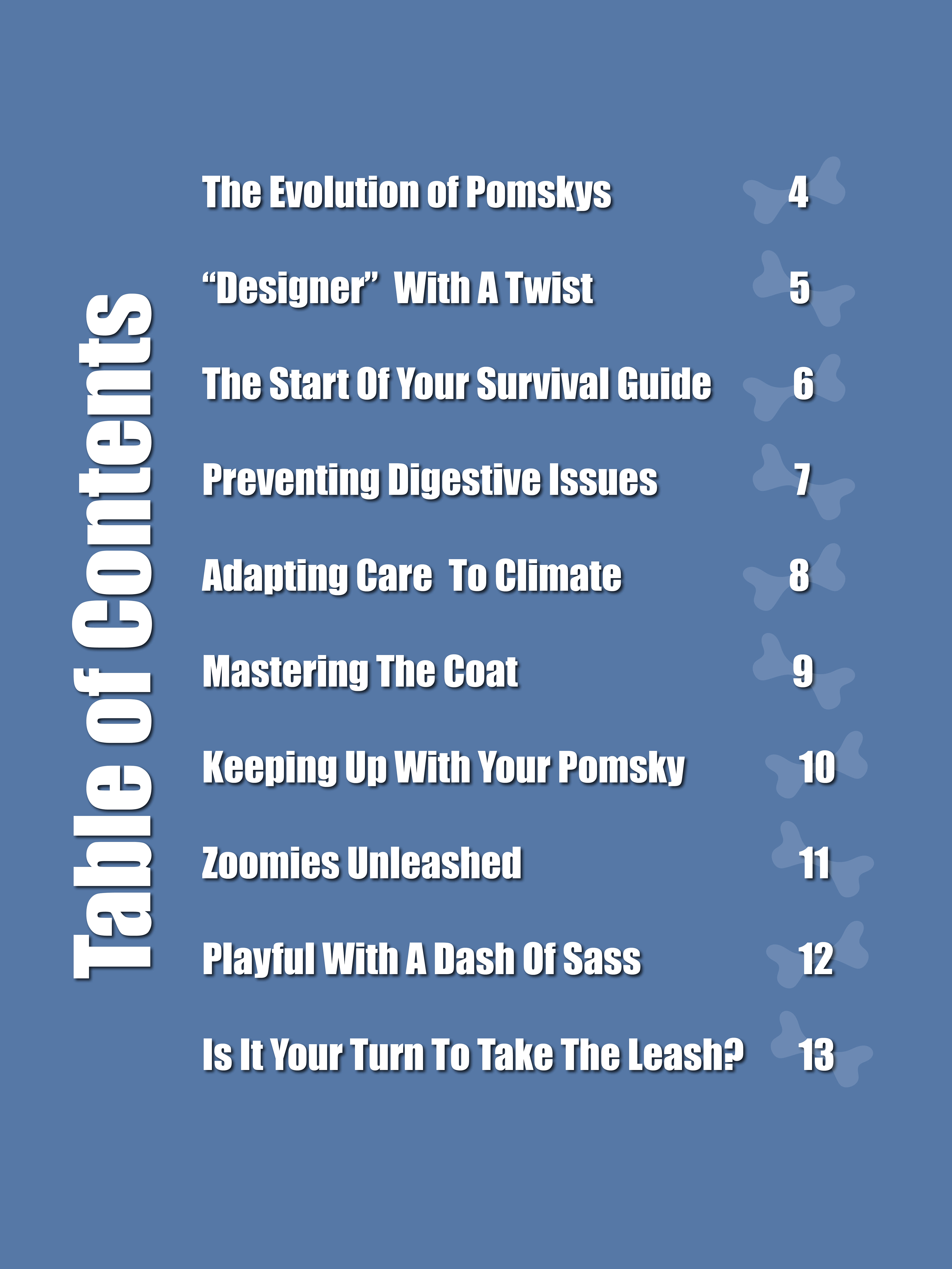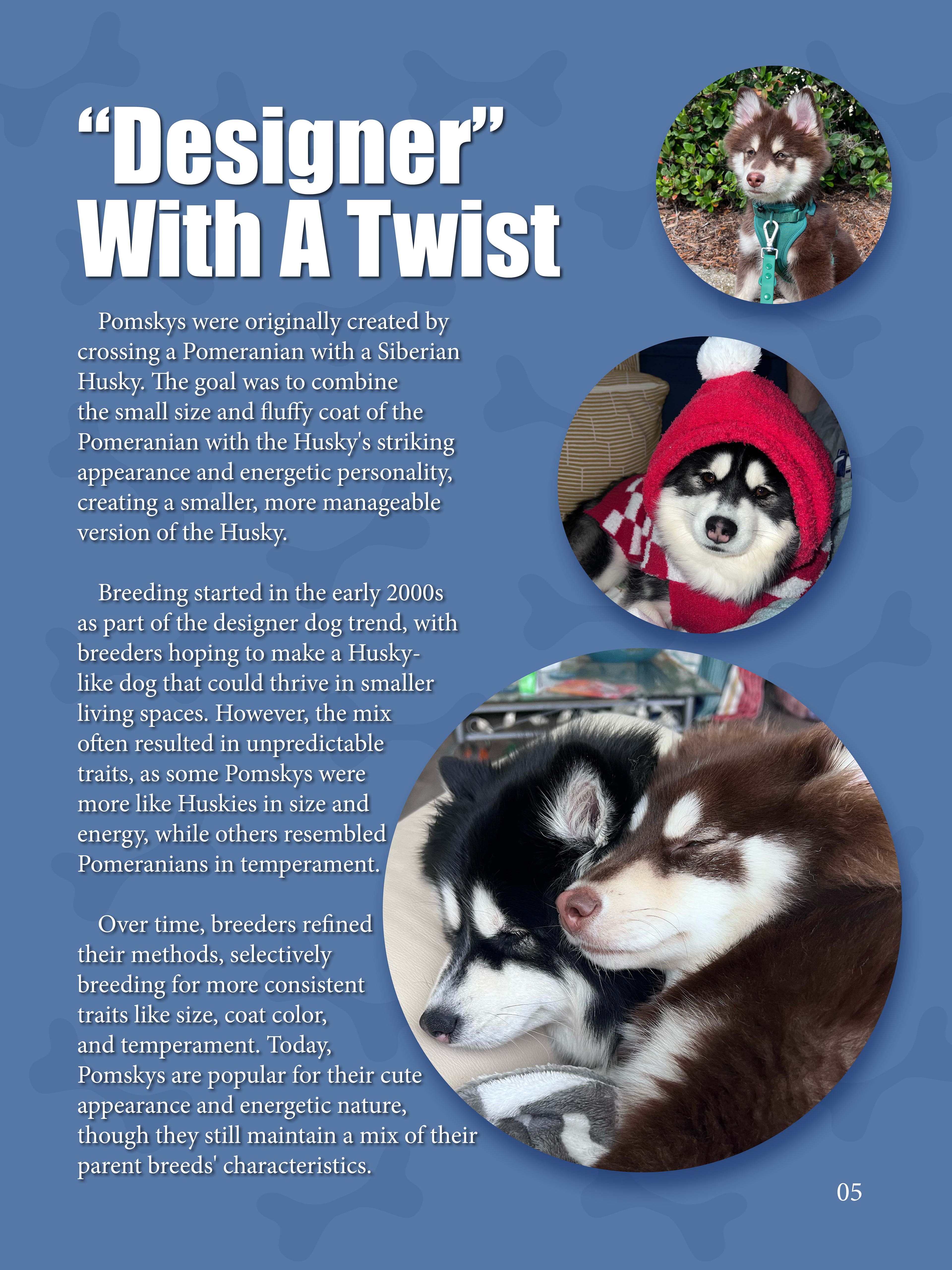 For this project, I designed a modern, editorial-style eBook about the Pomsky breed, combining my original photography with clean, magazine-inspired layouts. I used soft, playful colors, generous spacing, and a structured typographic hierarchy to make the information easy to read while giving each section a polished visual identity. Every spread blends balanced text columns with expressive, naturally lit photos to create a warm, inviting experience.